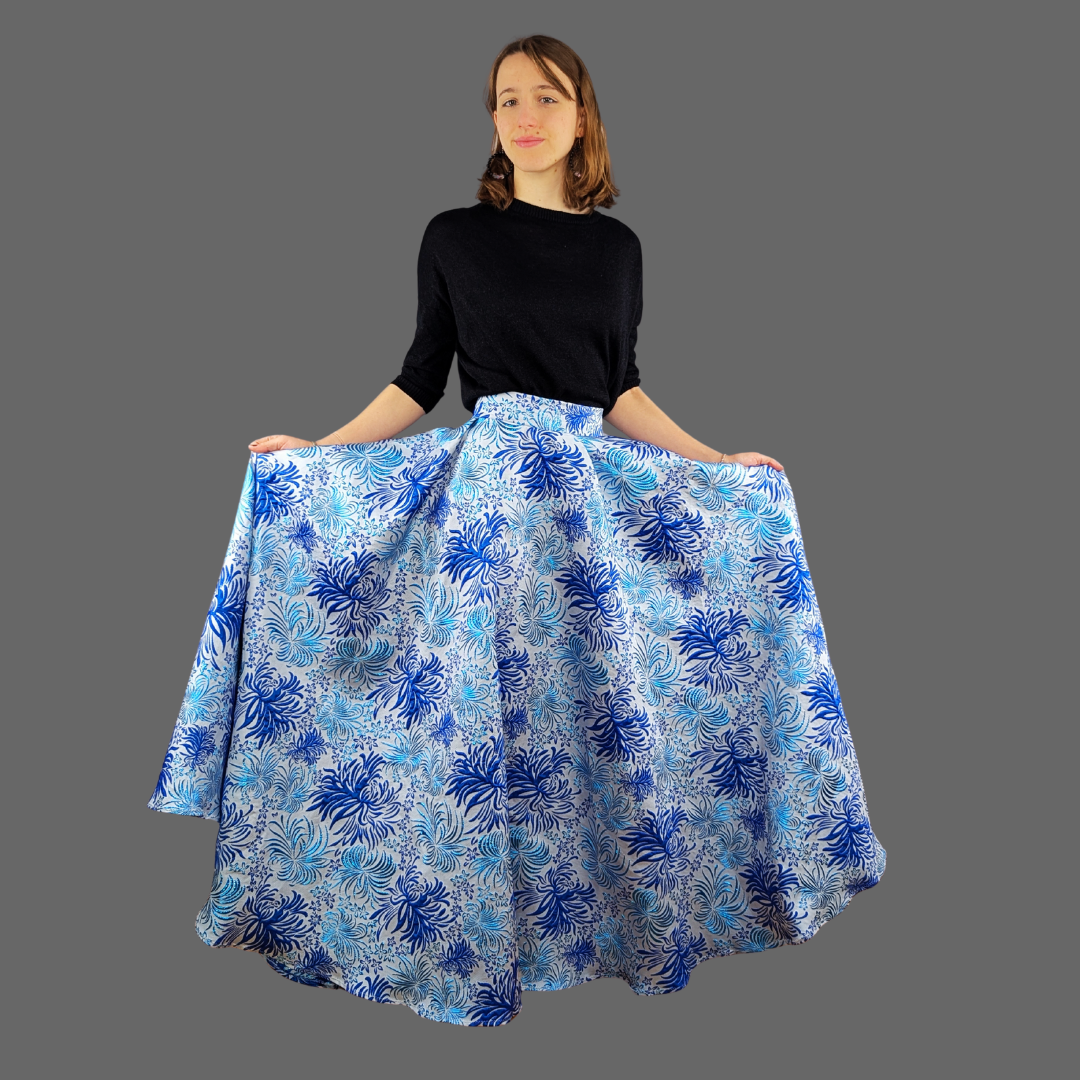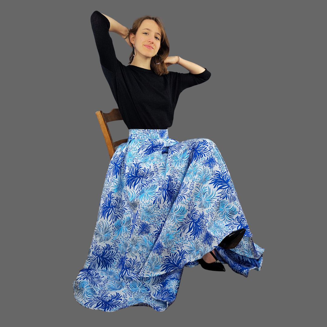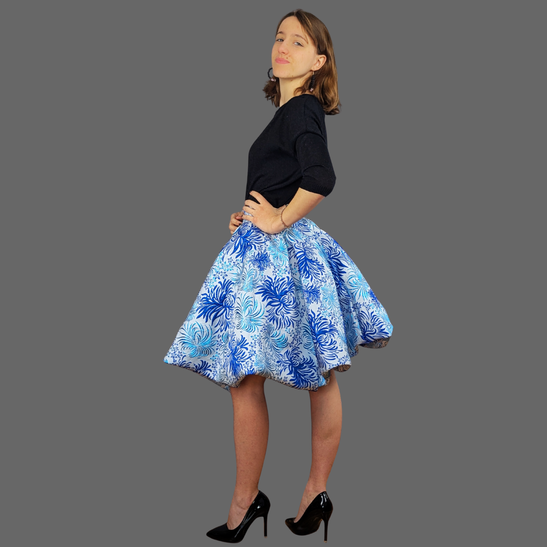 Cette jupe 360° signée Penovoilis est confectionnée en brocart jacquard structuré pour créer un véritable cercle complet.